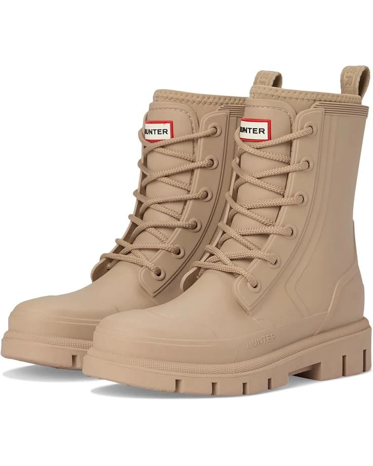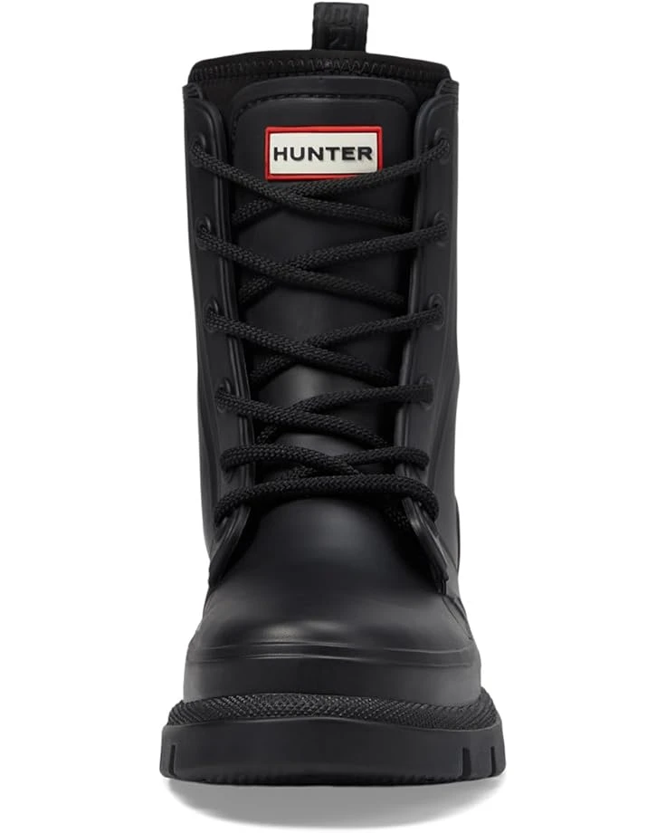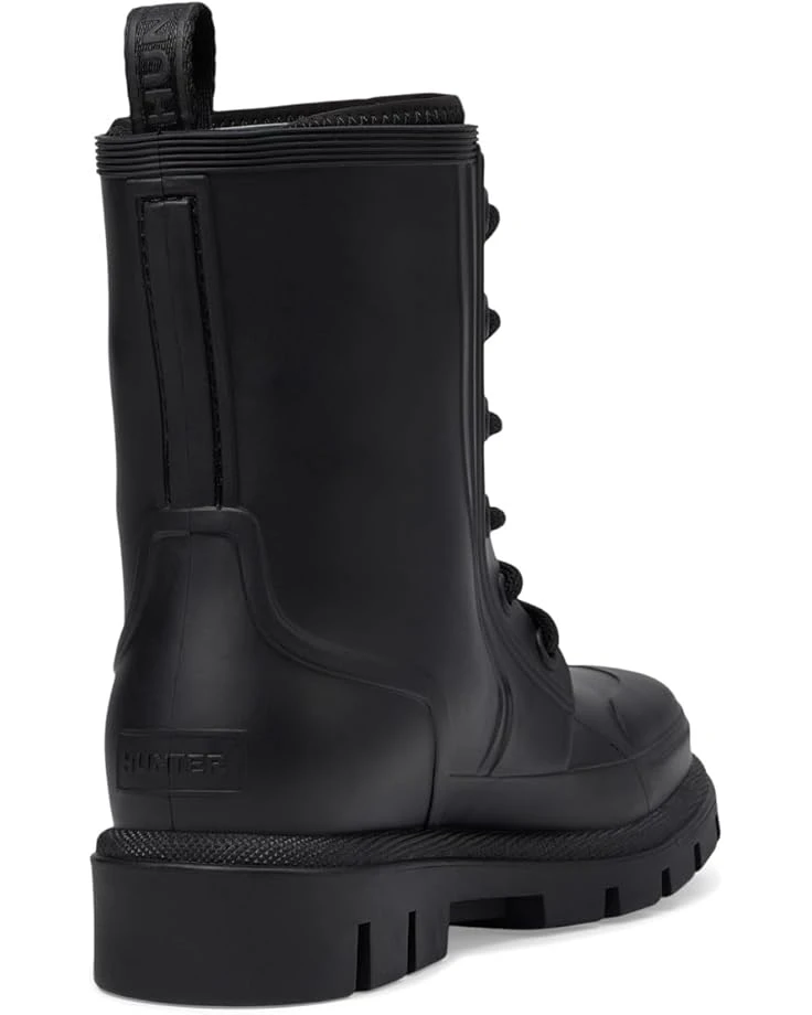 - The Hunter® Diana Waterproof Mid Calf Lace Up Boot is your go-to for any weather. Crafted with a durable rubber upper and outsole, it ensures ultimate protection from the elements. The cozy polyester lining and insole offer unmatched comfort for all-day wear. Featuring a classic lace-up closure and mid-calf length, these boots provide a secure fit and versatile style. Perfect for those rainy days, the closed toe design keeps your feet dry and snug.