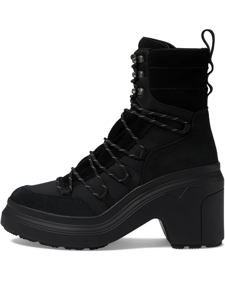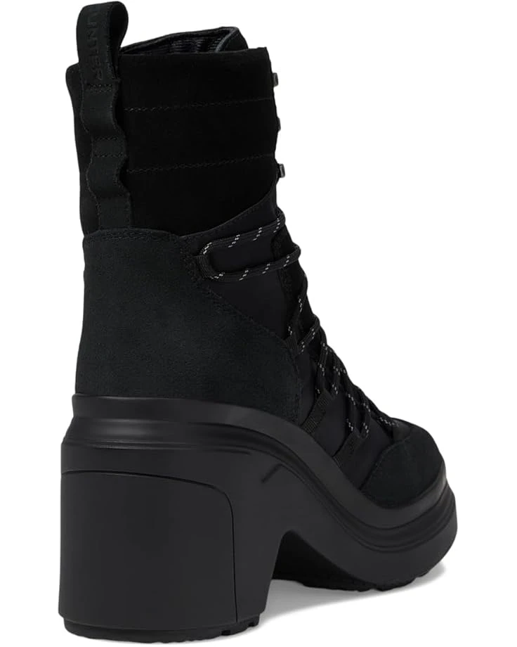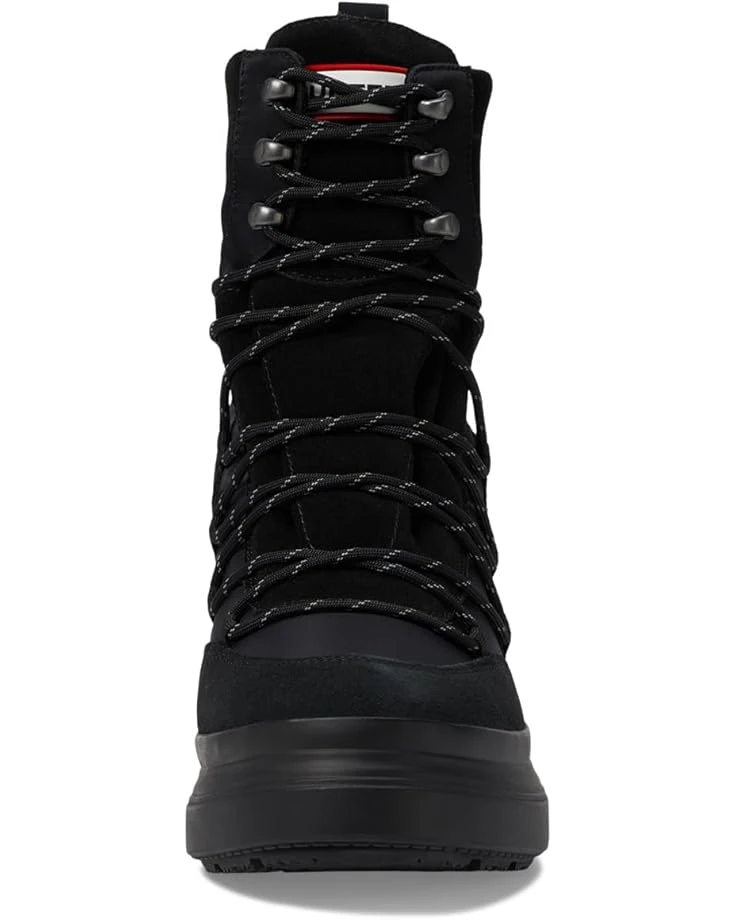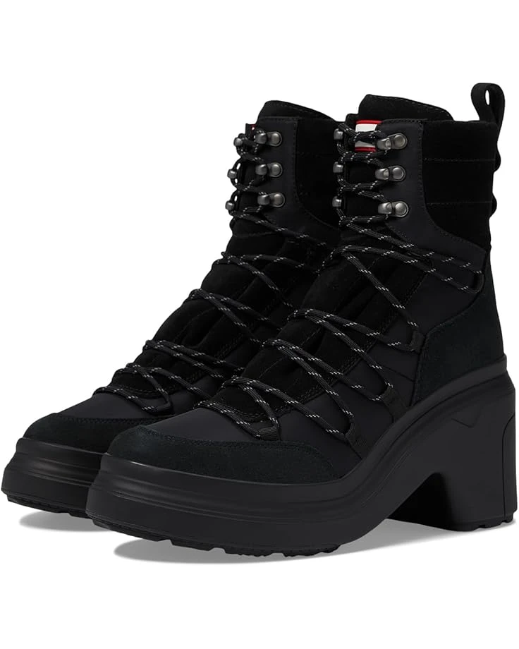 - Amp up the style statement while keeping up with the comfort wearing Hunter® Discoverer Mid Lace-Up Leather Heel Boot designed in a mid-calf length silhouette witha round toe shape and lace-up closure for easy adjustability. The boots come with a premium recycled nylon upper, recycled polyester lining, and removable recycled polyester footbed.