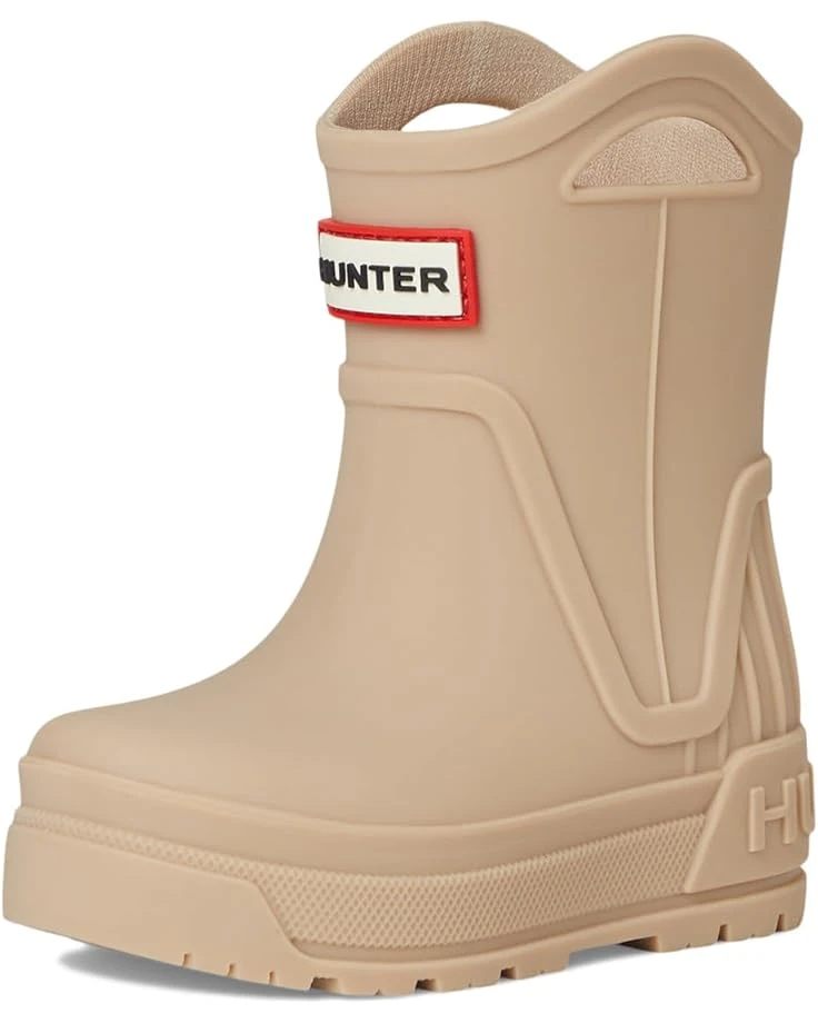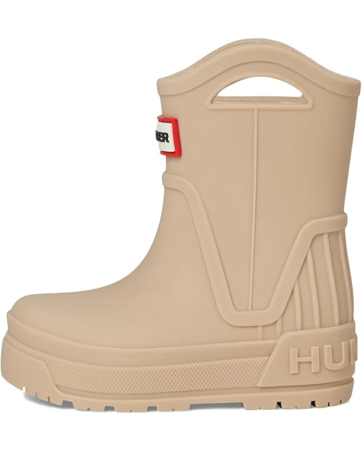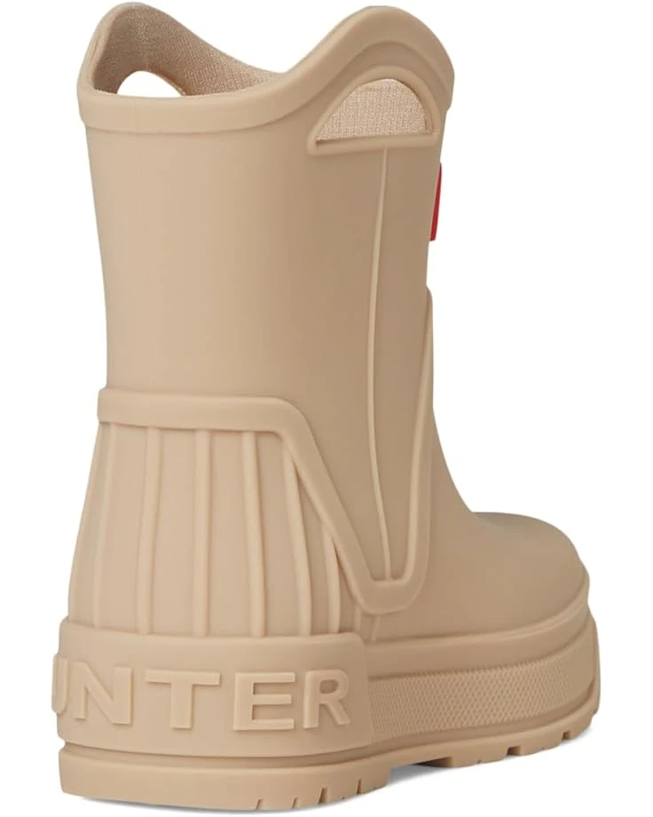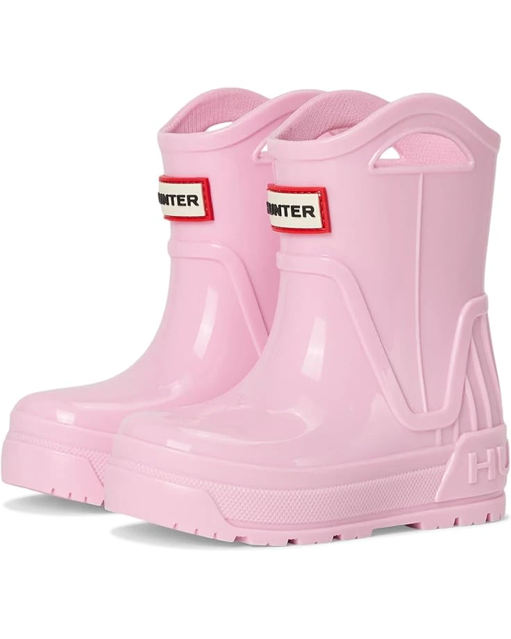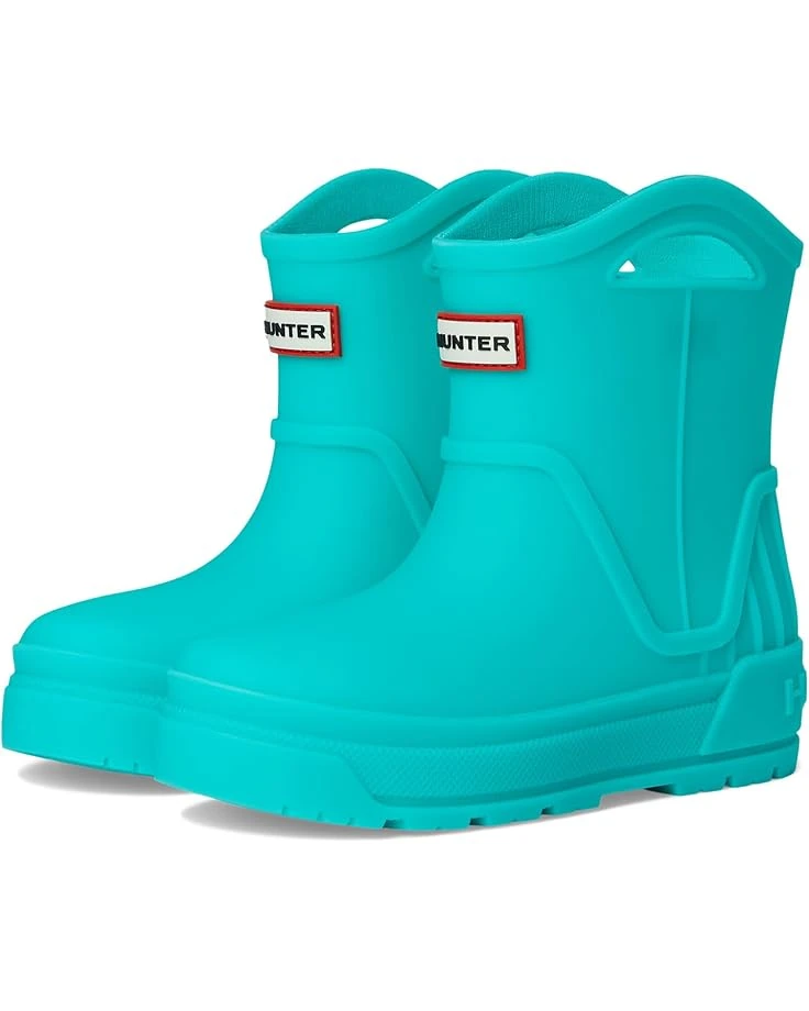 - Keep your little one’s feet protected from light or heavy showers with Hunter® Kids Finley Boots in mid-calf silhouette. The pull-on style, waterproof boots come with a man-made upper, recycled polyester lining, and a foam footbed. The cut-out details on the top allow easy pull on and the Hunter® logo detail gives them an authentic touch.