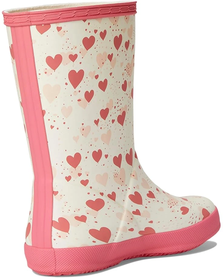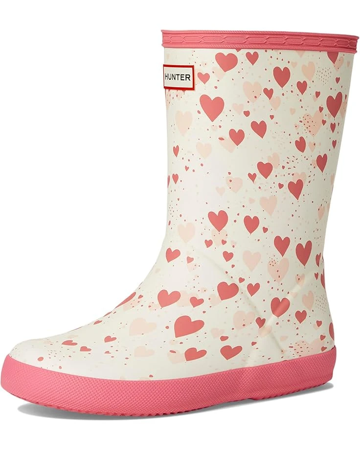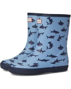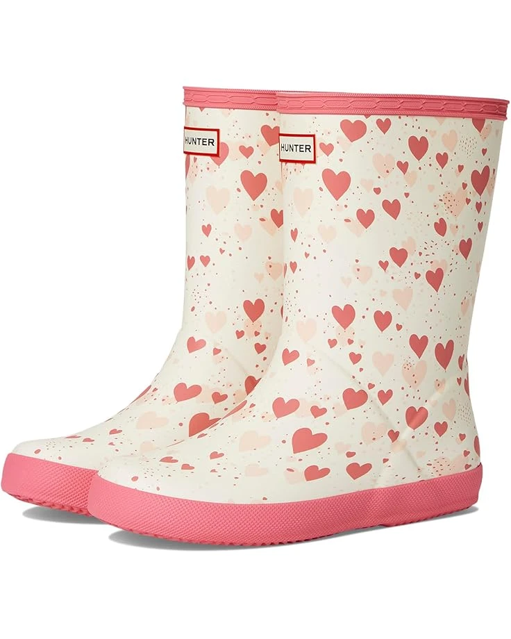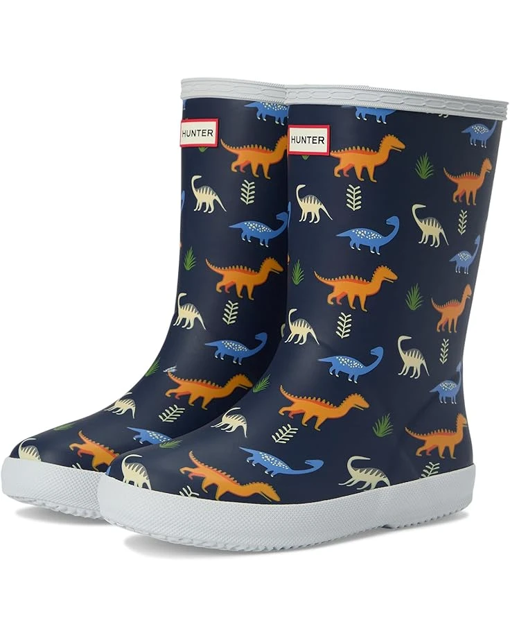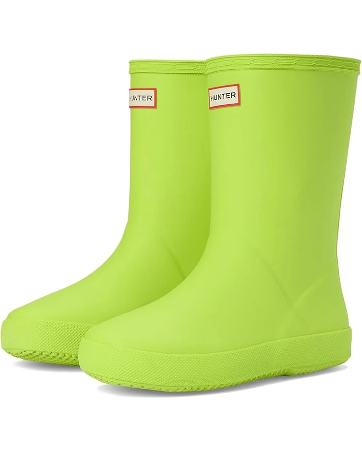 - A new take on the bestselling rainbow glitter boot, this Hunter® Kids First Classic Boot features a diagonal stripe print with a glitter finish that is perfect for playful puddle splashing. Handcrafted from natural rubber, these fully waterproof boots have a flat outsole for stability and a rounded toe gives little feet room to move. Featuring round toe, slip-on closure, and brand logo on the front.