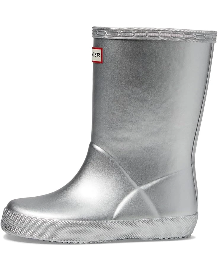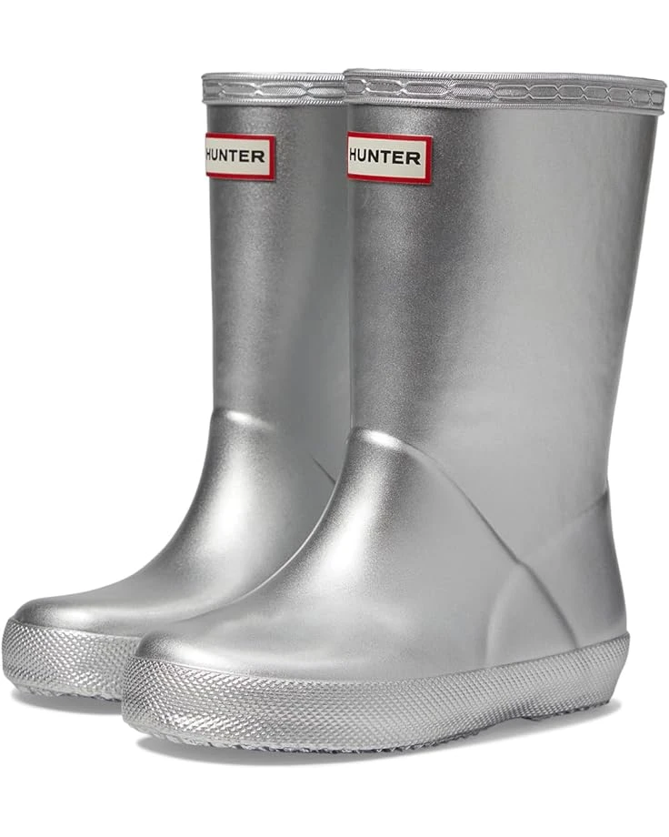 - Let your little one be carefree wearing the waterproof Hunter® Kids Original First Classic Metal Boots. This pull-on pair features rubber upper construction with recycled polyester lining and padded removable footbed.